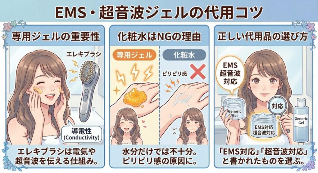 代用ジェルに必要なのは「導電性・保湿力・安全性」の3つです。